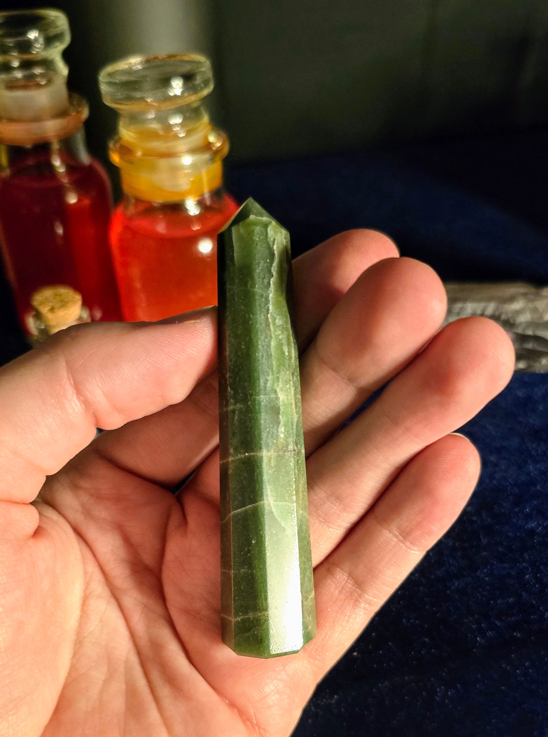 This listing is for one crystal. Size and shape may vary naturally. This beautiful Bowenite obelisk measures approximately 3 inches in height and features a flat bottom for stability.