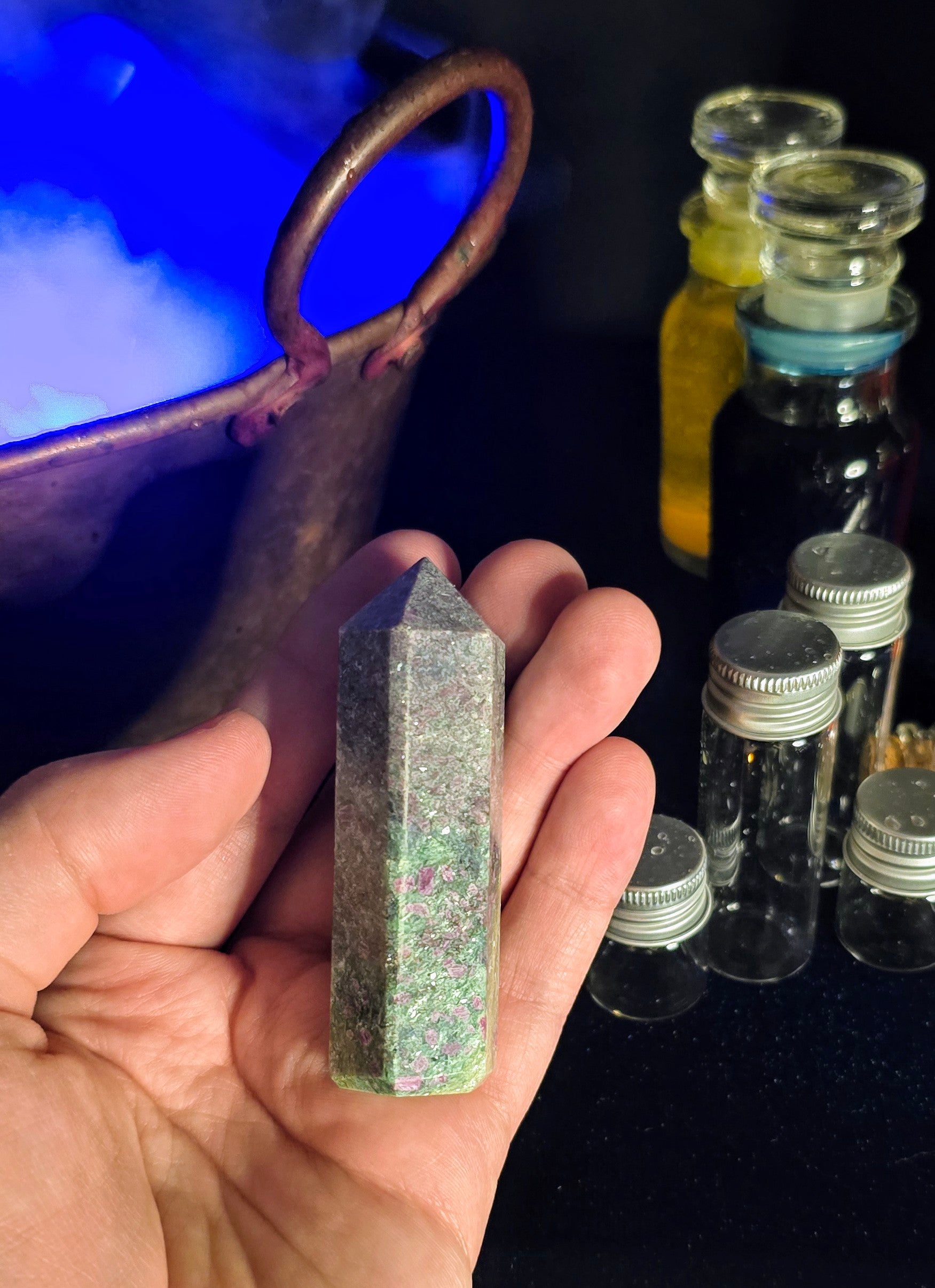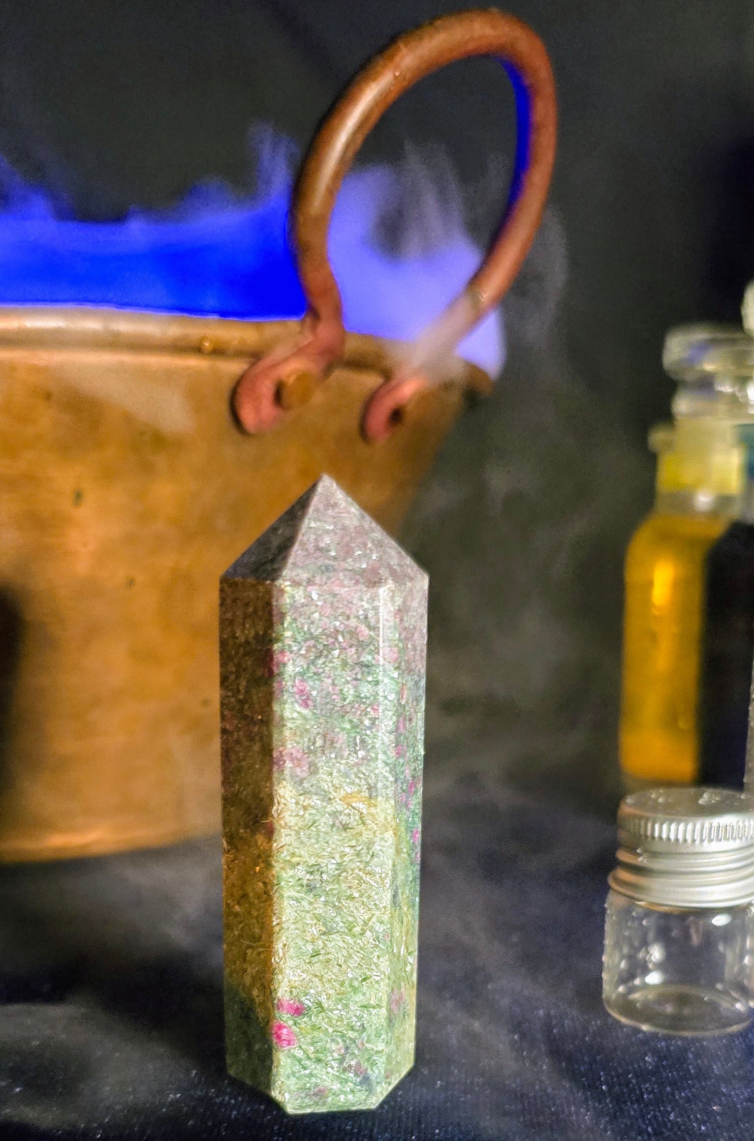 The Ruby Fuchsite Obelisk stands tall, a radiant union of lush green and deep red hues, sparkling with earthy charm, beckoning you to connect with your heart’s deepest desires.