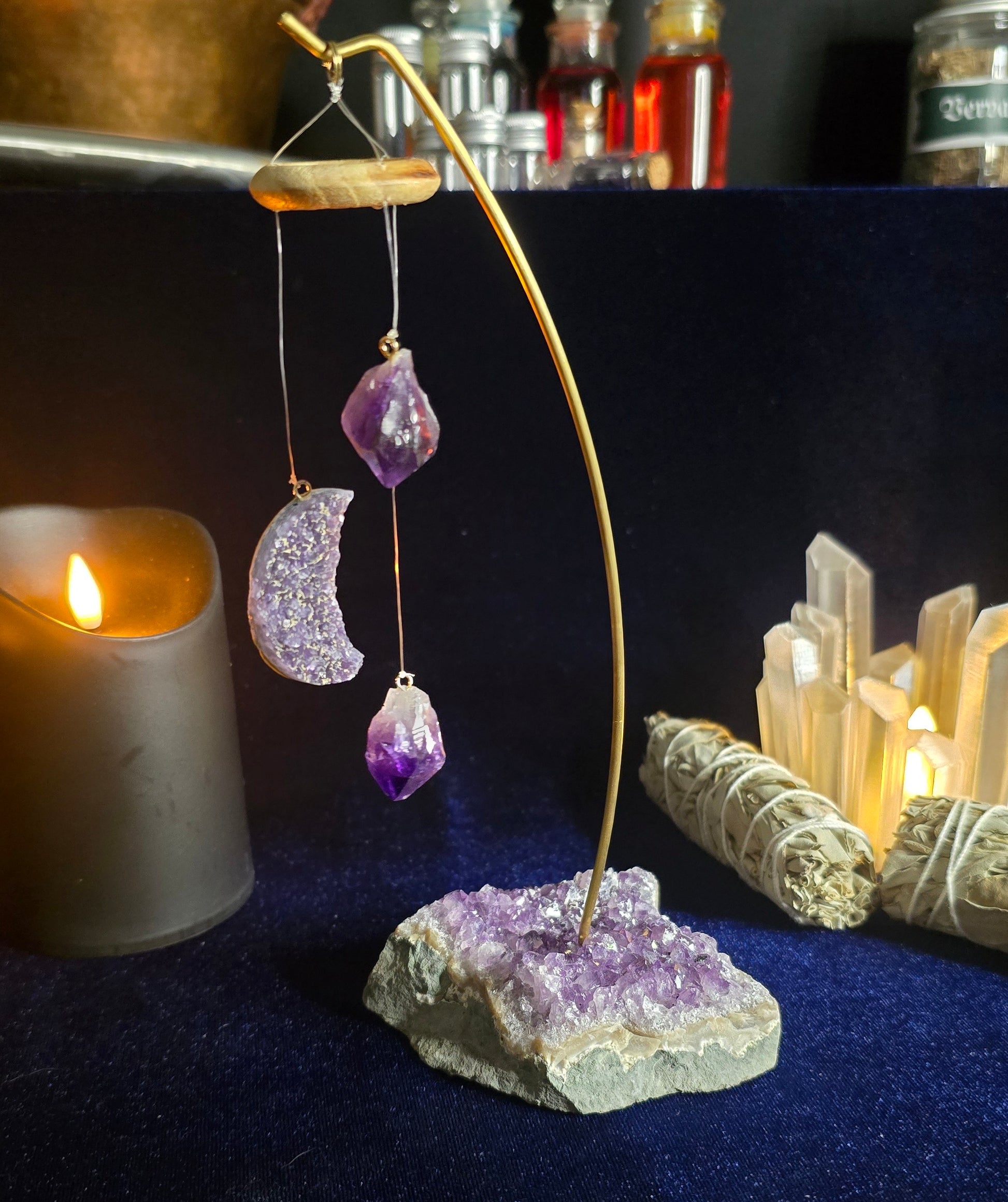 This is a table top chime created out of Amethyst pieces, moon and base. Feel the energy of these powerful healing crystals sway in the wind when you place this on any surface. 9" by approximate size only with varying colors and shapes.